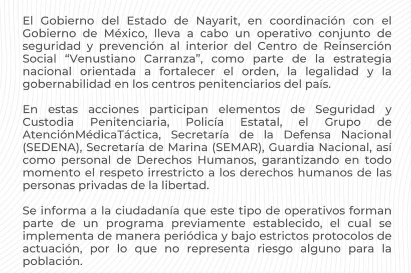 Estado OPERATIVO AL INTERIOR DEL PENAL ES PARA SEGURIDAD Y PREVENCIÓN, INFORMA EL GOBIERNO Redaccion abril 14, 2026 0 El Gobierno del Estado de Nayarit, en coordinación con el…