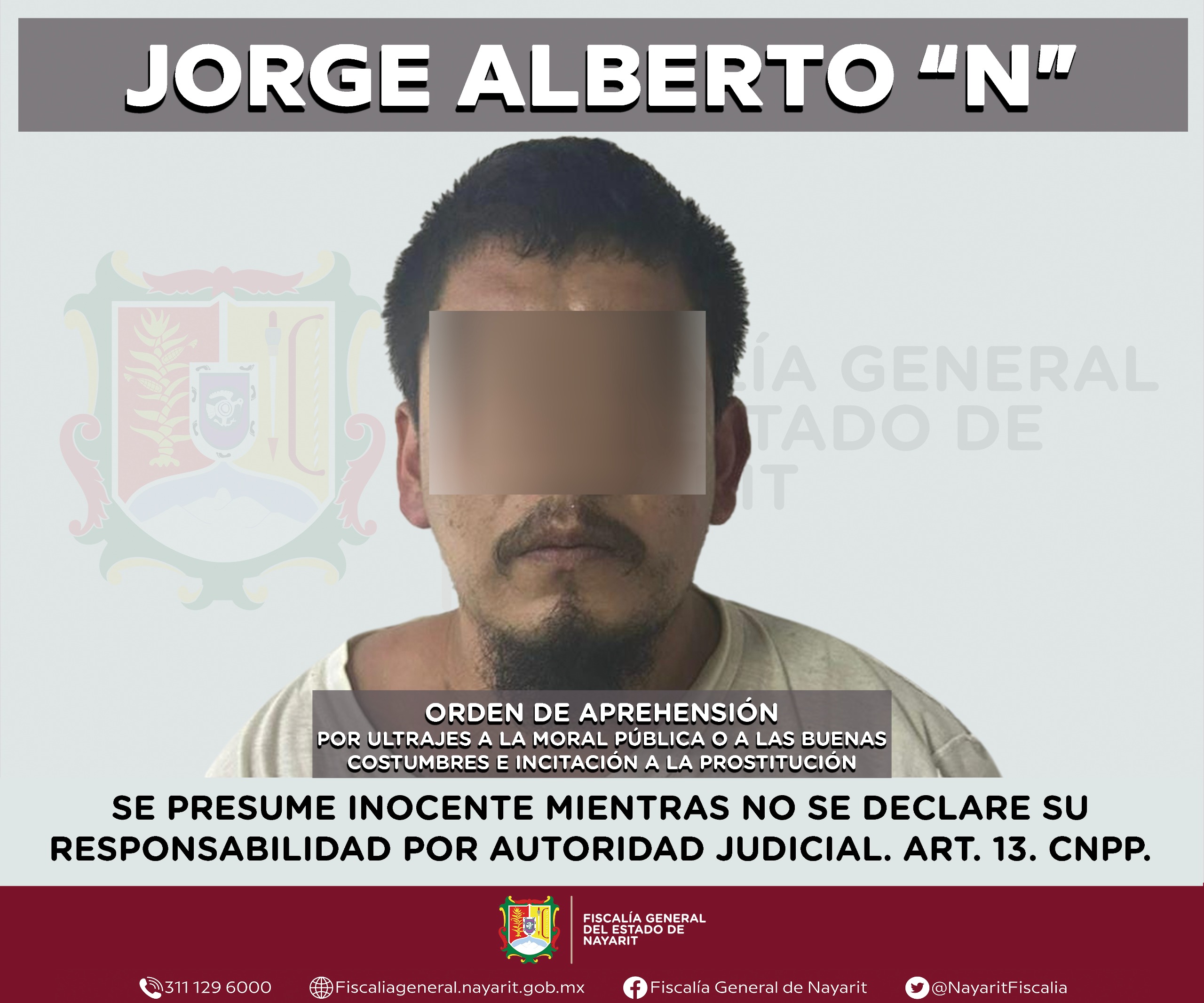 La Fiscalía General del estado de Nayarit informa que elementos de la Agencia de Investigación Criminal ejecutaron una orden de aprehensión en la ciudad de Tepic contra Jorge Alberto “N”, por su probable participación en hechos que la ley tipifica como delitos de ultrajes a la moral pública o a las buenas costumbres e incitación a la prostitución, cometidos contra una persona de sexo femenino de quien por respeto a su derecho a la privacidad e integridad se reserva la identidad.