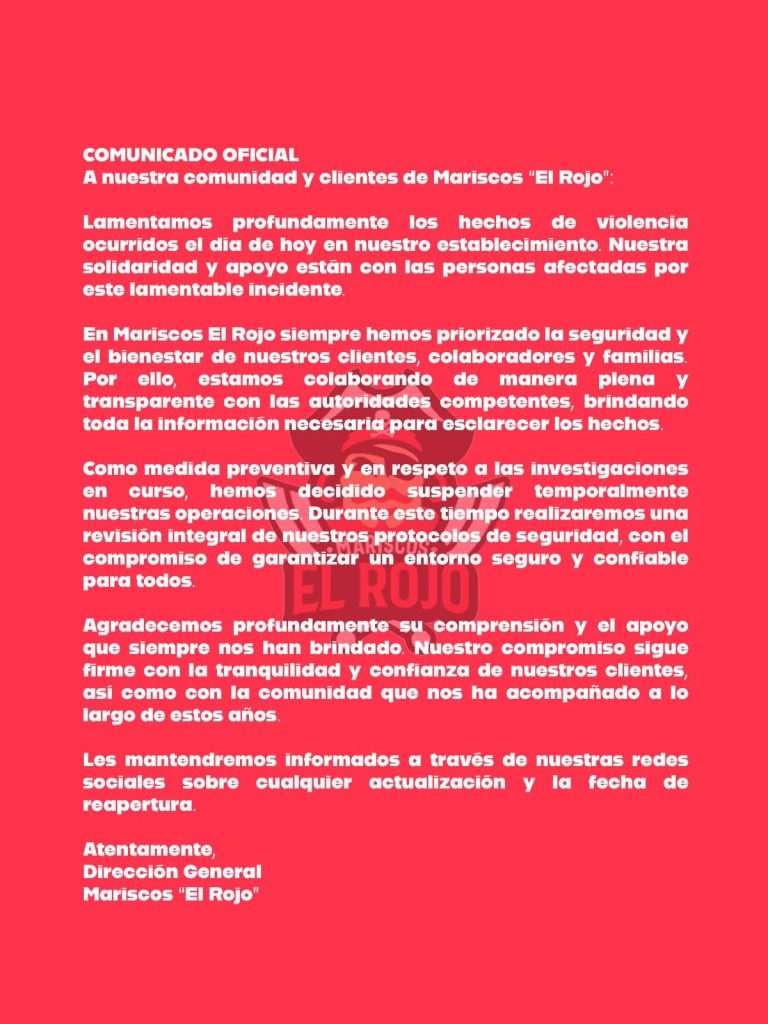 Hasta el momento nada se sabe del paradero de la víctima del grupo delincuencial. Por su parte, el propietario del lugar, conocido como «el rojo» dio a conocer un comunicado en donde fija su postura en torno a este hecho que ha generado la preocupación Ciudadana.