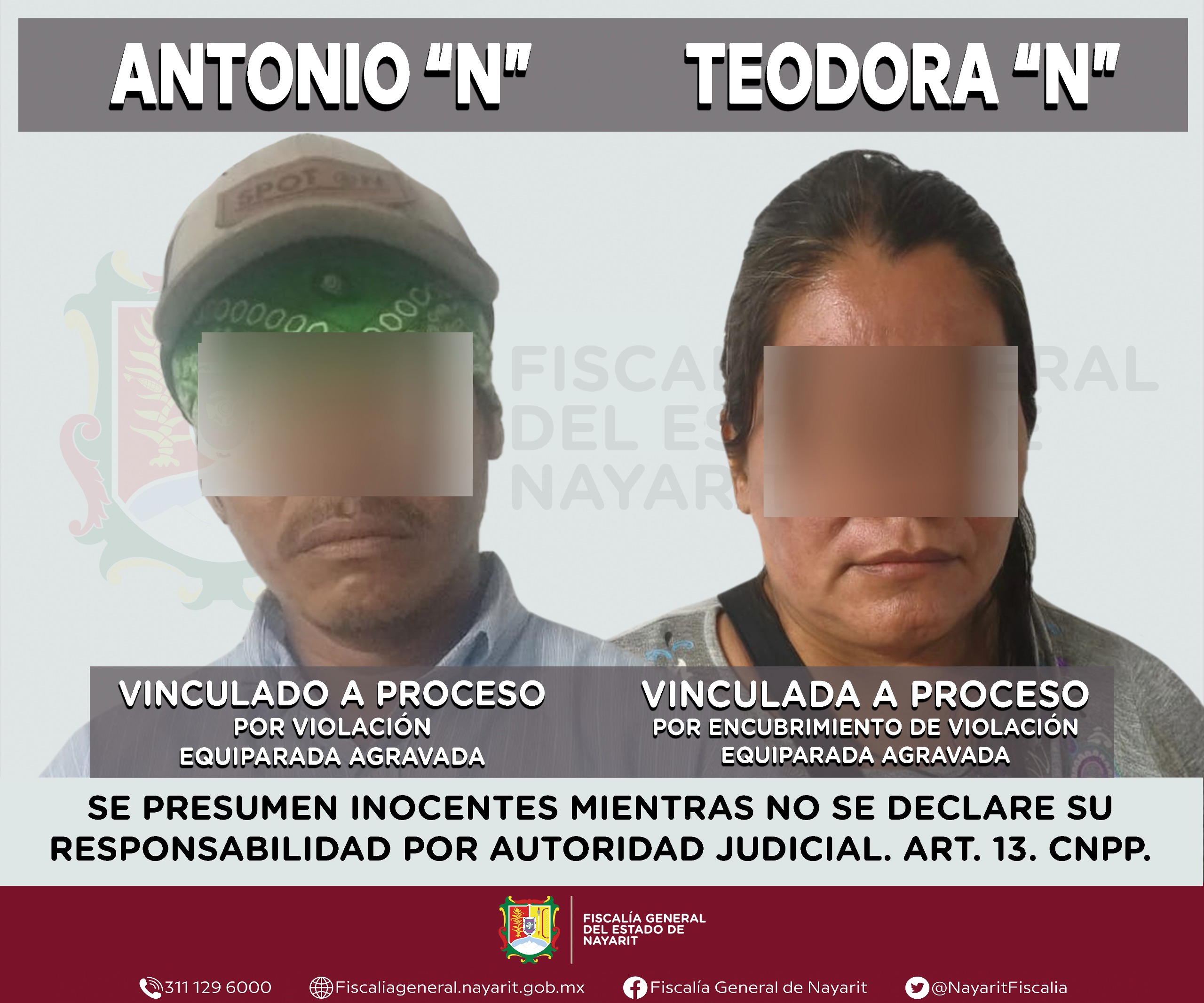 La Fiscalía General del estado de Nayarit informa que un Juez de Control dictó auto de vinculación a proceso contra Antonio “N”, por su probable participación en el delito de violación equiparada agravada, así como contra Teodora “N”, por su presunta responsabilidad en el delito de encubrimiento de violación equiparada agravada, en agravio de una adolescente cuya identidad se mantiene bajo reserva para proteger sus derechos.