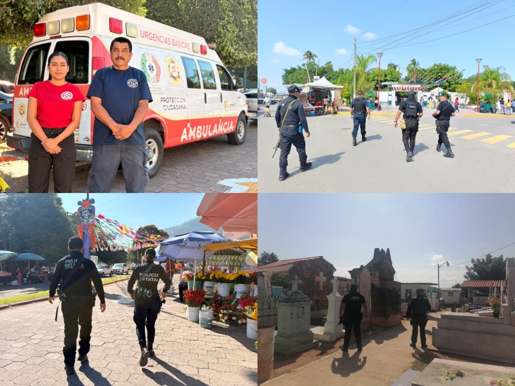 Con motivo de esta tradicional celebración, se desplegó personal de la Policía Estatal y Bomberos de Nayarit, en coordinación con autoridades municipales, para realizar recorridos pie tierra, aéreos y motorizados en panteones y zonas aledañas. Asimismo, se instalaron puestos de inspección móviles con el propósito de reforzar la presencia policial y garantizar el orden público.