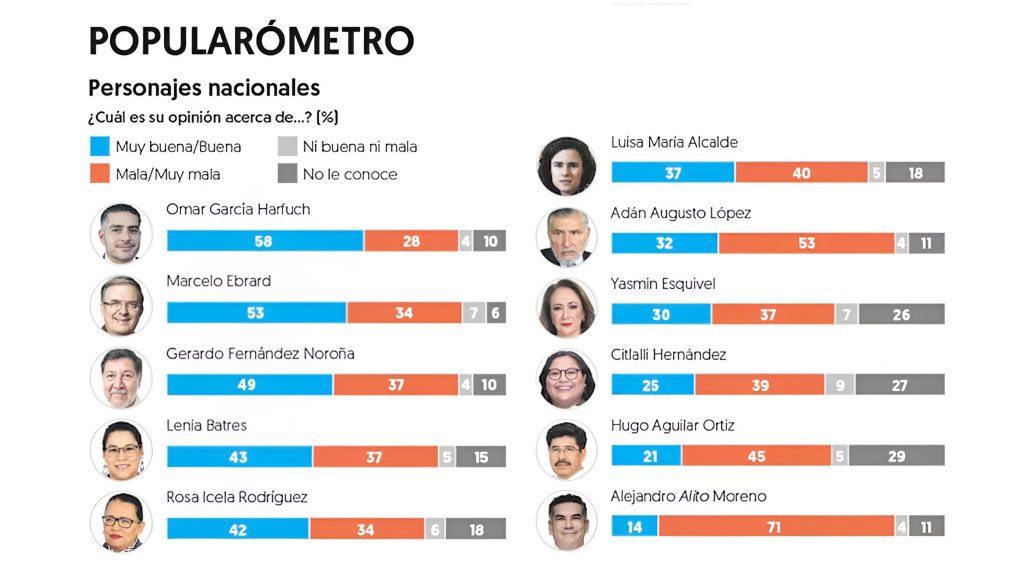 En la lista de impopularidad de la encuesta, a Adán Augusto solamente lo supera Alejandro ‘Alito Moreno’, senador y líder del PRI, quien registra 14% de opinión favorable y 71% de opinión desfavorable en este mes. En julio de 2024, el priista tenía 15% de positivos y 40% de negativos, por lo que es claro que también se ha deteriorado su imagen, a pesar de que el zafarrancho con Fernández Noroña parecía haberle traído simpatías.