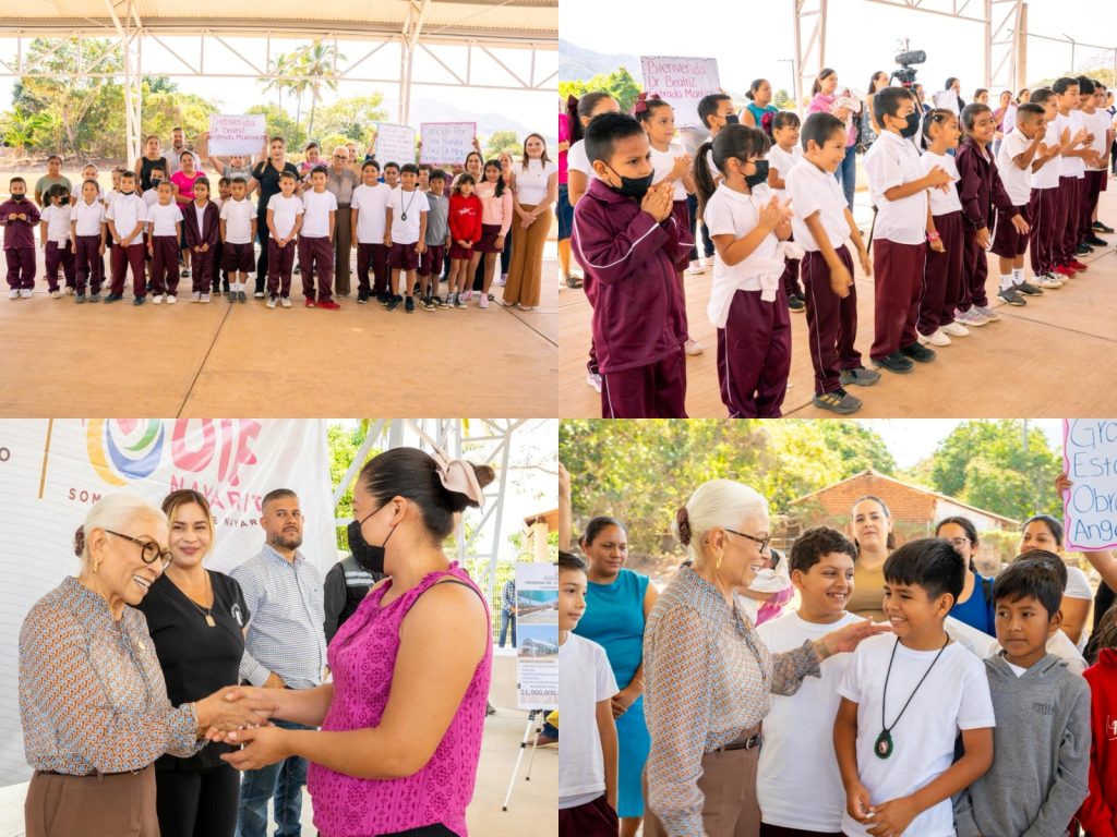 La presidenta del Sistema DIF Nayarit, doctora Beatriz Estrada Martínez, hizo entrega de un domo escolar, así como la construcción de un muro y trabajos de pintura en la escuela primaria Dr. Julián Gascón Mercado, ubicada en la localidad de Huaynamota, municipio de San Blas, respaldando el trabajo del Gobierno del Estado en beneficio de las niñas y los niños, así como del personal docente, al mejorar las condiciones de infraestructura educativa.