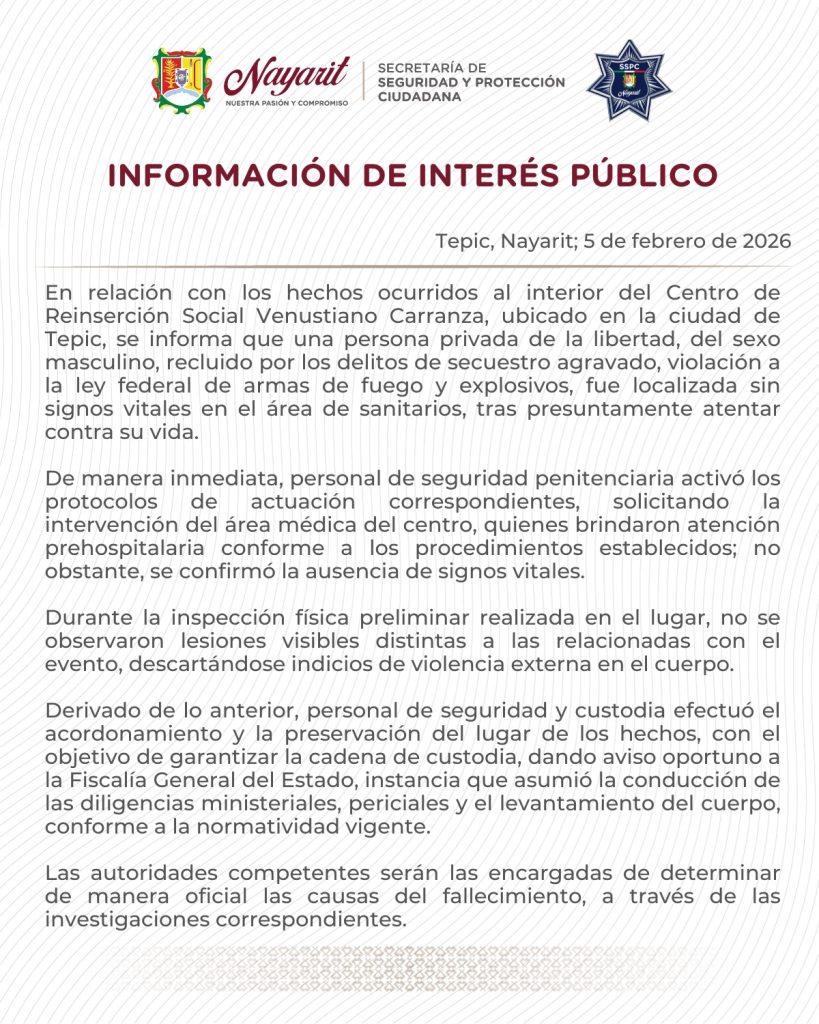 En relación con los hechos ocurridos al interior del Centro de Reinserción Social Venustiano Carranza, ubicado en la ciudad de Tepic, se informa que una persona privada de la libertad, del sexo masculino, recluido por los delitos de secuestro agravado, violación a la ley federal de armas de fuego y explosivos, fue localizada sin signos vitales en el área de sanitarios, tras presuntamente atentar contra su vida.