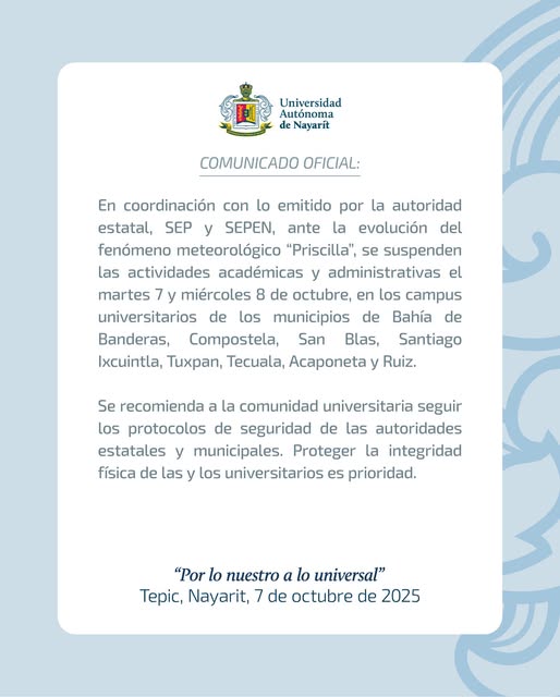 A través de un comunicado en las redes sociales, la Universidad Autónoma de Nayarit dió a conocer la suspensión académicas y administrativas de las escuelas ubicadas en zonas en las cuales el Huracán